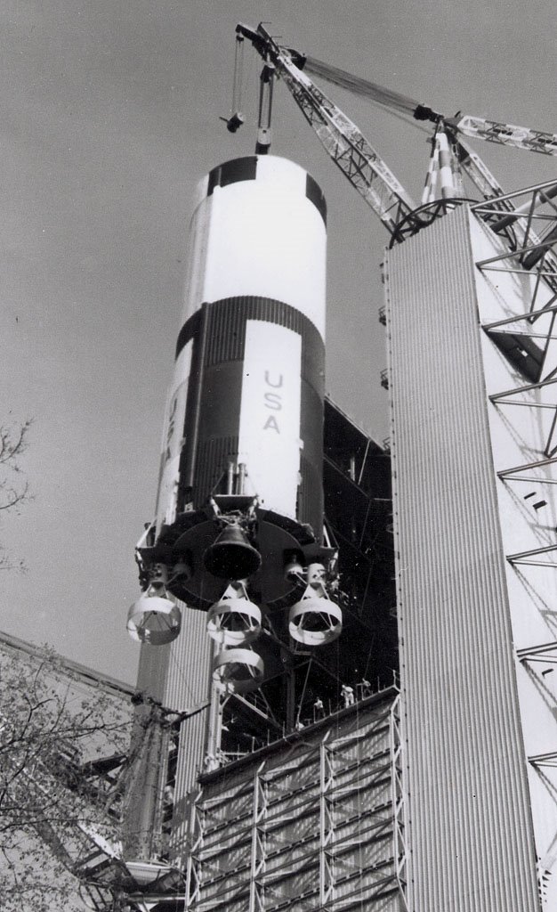 Se desacoplan los módulos y se establece la órbita terrestre. El imponente Saturn V de más de 110 metros de altura era un vehículo de lanzamiento de múltiples etapas y motores, más alto que la Estatua de la Libertad. En total, los motores Saturn V produjeron tanta potencia como 85 Presas Hoover En esta imagen se puede observar la primera etapa de Saturn V elevándose del suelo mediante una grúa tras.